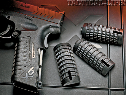 The modular XDm series comes with an interchangeable backstrap system that allows the user to customize the fit of the grip to their hand.