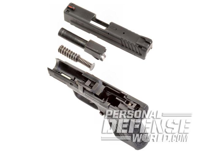 Being a striker-fired design, the XDs have no second-strike capability; however, they do have a very quick-reset trigger mechanism that requires the slide to be withdrawn a mere 0.25 inches to re-enable the action. Internally, the XD Mod.2 models use the same proven Browning-type short-recoil system as all XD series semi-autos. The barrel design employs the later Browning solid camming lug, and locks to the slide with a squared face on the breechblock. A steel locking block, through which the disassembly lever passes, is pinned to the XD’s lightweight polymer frame. Finally, and very important with the .40 S&W and .45 ACP models, the recoil is tempered by Springfield’s dual recoil spring assembly, which has a large coil spring and secondary smaller coil spring within a captive, two-piece guide rod assembly.