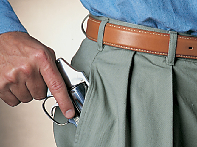 Today’s pocket holsters generally have anti-slip texturing, coarse-side-out leather or other design features (sometimes even a sculpted hook) that will help the holster remain in your pocket as you draw the gun from within it. The downside to these holsters is that you typically have to fish your fingers carefully between the leather outer panel of the holster and the grip of your gun—you can’t just ham-fist the first thing you touch—which takes a certain getting used to.
