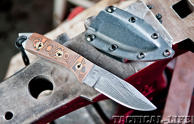 Bates offers about 10 different styles of knives, all with fixed blades and G10 grips. He also makes the Kydex sheaths for each of the knives. He steadfastly refuses to use blanks, insisting that he wants to control every aspect of the manufacturing process to offer a truly handmade knife. He has even taught himself to pattern weld to produce his own Damascus blades.