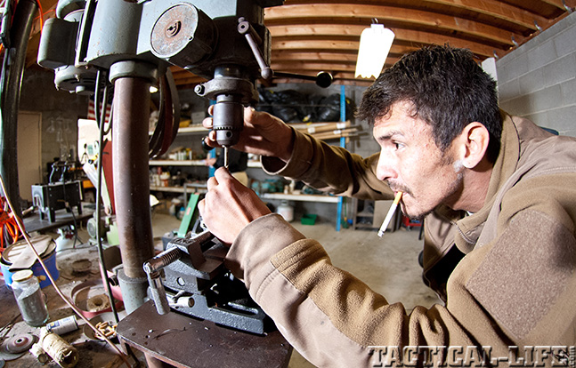 While I was in his shop, he was working on one of his biggest sellers—the Stubby—a fixed, 3-inch-bladed knife with incredible balance. Bates cuts each blade from 1095 high-carbon steel. His shop has rudimentary machinery—a couple of drill presses, belt sanders, a small forge and an anvil secured to a tree stump bolted to the cement floor of his 30-by-30-foot workshop.