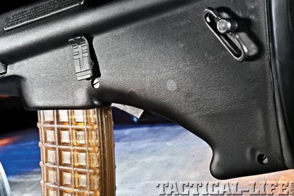 Magazine Group: The magazine of the AUG/A3 comes in 30- and 42-round variants and is manufactured from a transparent synthetic material with the classic “amber” hue. The staggered, box-type magazines feature round-count markers at the 10-, 20- and 30-round marks (and also at 42 on the 42-round magazine). The 30-round unit is 7.25 inches long, and the 42-round unit is 9.25 inches long.