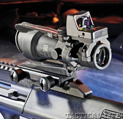 Raging bullpup! Steyr Arms’ AUG/A3 SA is ready for CQB yet still maintains a 16-inch barrel for better ballistics. Shown with a Trijicon ACOG with Docter sight.