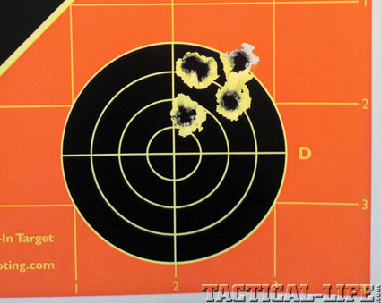 I settled in at the bench and began to evaluate the rifle’s accuracy. I used a sampling of .223 ammo: Winchester 45-grain JHP, PMC 55-grain FMJ and Hornady TAP 75-grain FPD. With a target set up at 100 yards, I began testing my three test loads with three 5-shot groups from each. Despite the fact that bullpups (due to their long trigger linkage) have notoriously bad trigger pulls, the Steyr’s was actually pretty smooth (despite a 9-pound pull weight). Accuracy was remarkably good, with it notably favoring the lightest of the loadings—no doubt due to the 1-in-9-inch rate of twist. However, considering the “bullpup” trigger, I thought all the results were extremely good.