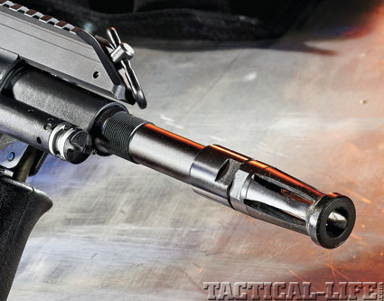 The cold-hammer-forged barrel features the classic “tulip” muzzle brake design. Note the two-position gas regulator left of the barrel.