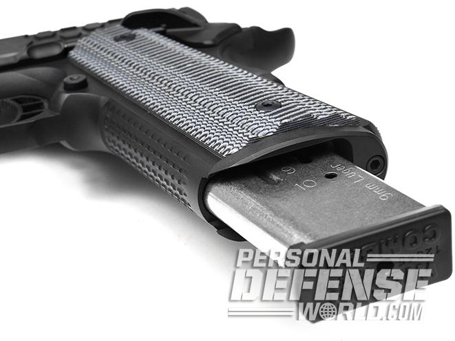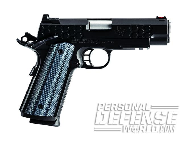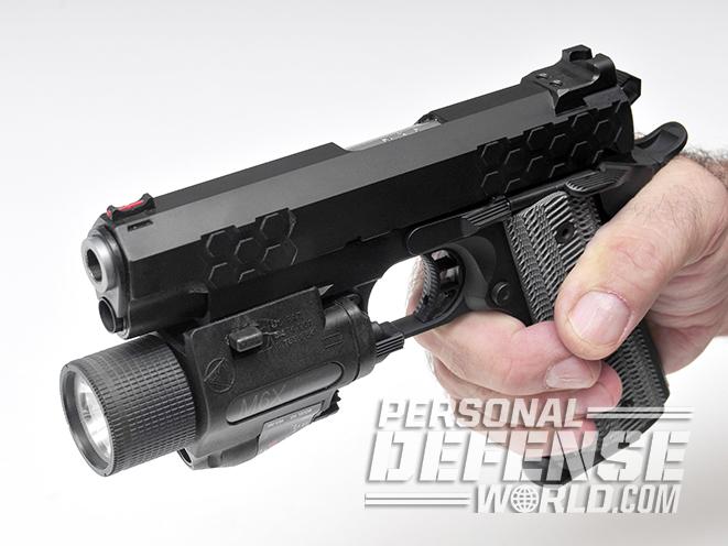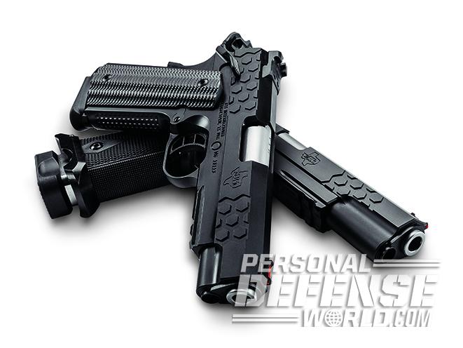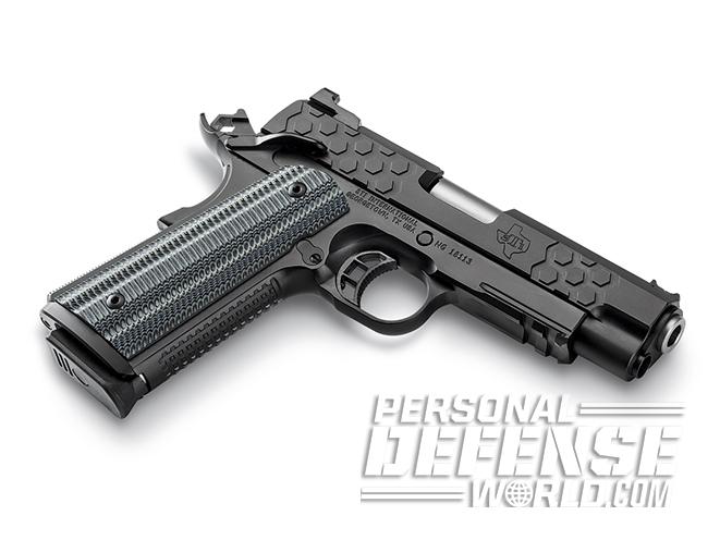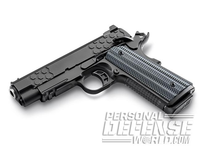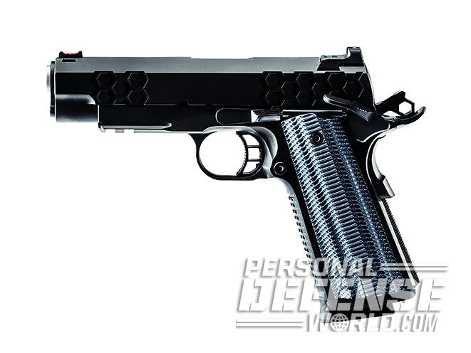 An ambidextrous thumb safety comes standard, as does a skeletonized trigger with an overtravel adjustment screw, a beavertail grip safety with a palm swell and an elongated, lightweight hammer with a hexagonal shape. The frame has a short dust cover with an integral rail for mounting lights, lasers or other tactical accessories. The magazine release and slide stop lever are both mounted in the proper 1911 positions.