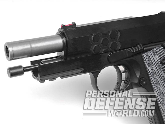 One glance at the pistol and you’ll know where its name comes from. Instead of serrations or grasping grooves, the slide has a series of intricately machined hexagonal cuts at the front and rear. These provide an extremely secure purchase when racking the slide to chamber a round or clear a (hopefully rare) jam. While these are eminently practical, there is a slight downside. I shoot a 1911 with a high-thumb grip (thumb on top of the safety), and on a few occasions I held my thumb against the slide, which resulted in some abrasion from the hexes. Of course, pain is an excellent teaching tool, and I quickly learned to place my thumb under the safety for the rest of the testing.
