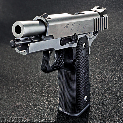The STI V.I.P. is a compact, high-capacity rendition of the classic 1911 design featuring a stainless steel slide atop STI’s modular alloy frame and a tactile nylon polymer grip.