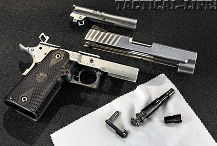 STI’s Recoil Master system uses a plastic sleeve to contain the recoil spring/guide rod unit when you remove them from the pistol, greatly easing the disassembly process of the pistol.