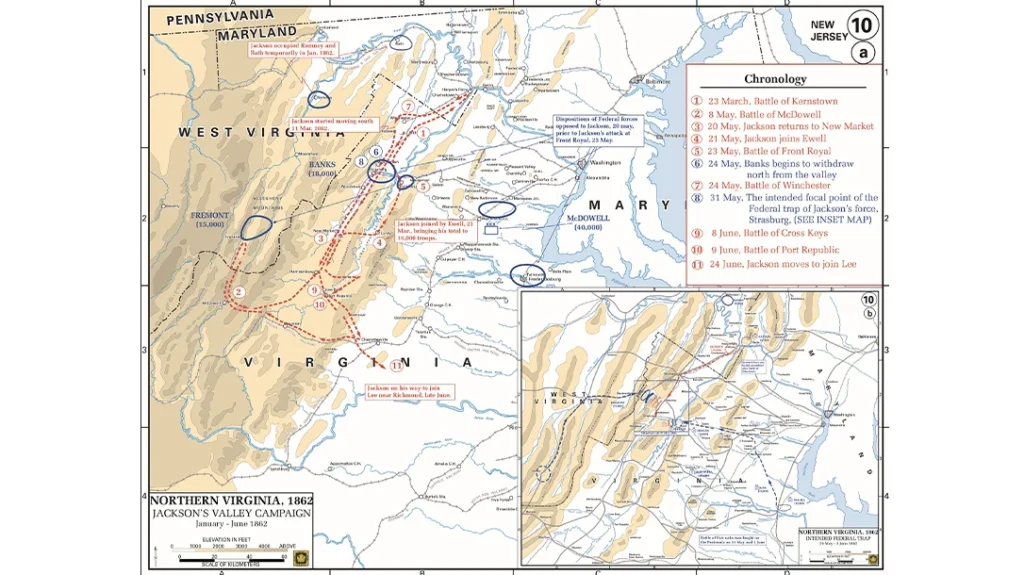 Jackson’s Shenandoah Valley Campaign lasted from his March 23 attack on Kernstown to the final repulse of Shields and Fremont in early June at Cross Keys and Port Republic. He never had more than 17,000 men at his disposal. Jackson’s decisive maneuvers prevented his adversaries from concentrating against his small army and overwhelming it, while he threw his full weight on their flanks.