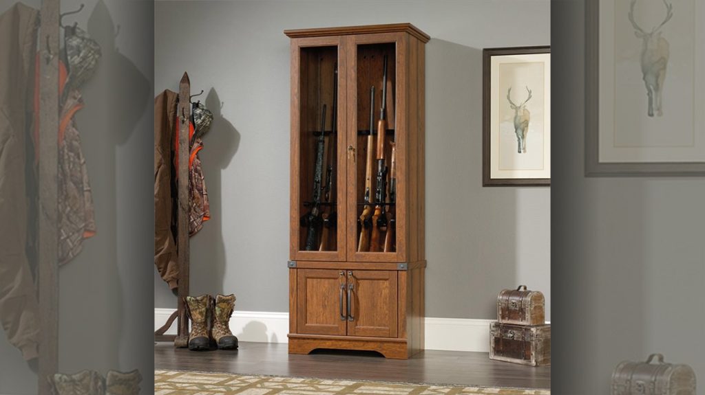 Although they can be almost as expensive as a gun safe, you can find inexpensive options. Ranging from display cases to simple cabinet style, this is a good, lockable option for storing a long gun or two (or many more). They are typically lockable and prevent easy access. However, display models have glass fronts, so they will not protect against theft. If you choose this option, make sure to keep the guns unloaded for additional safety.