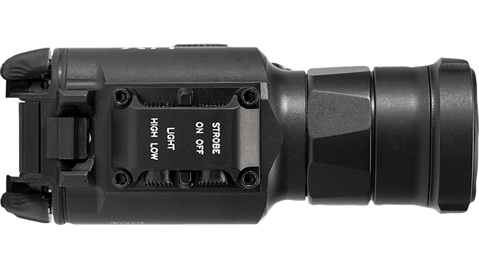 According to the press release, the XH35 pairs a recoil-proof LED with a “precision, undulated reflector” to create the company’s MaxVision Beam touted as being good for closer-range engagements. The weaponlight comes with two mode selector switches. One switch toggles between 1,000 lumens and 300 lumens. The second switch toggles between continuous light operation and a strobe mode described by SureFire as “disorienting.”