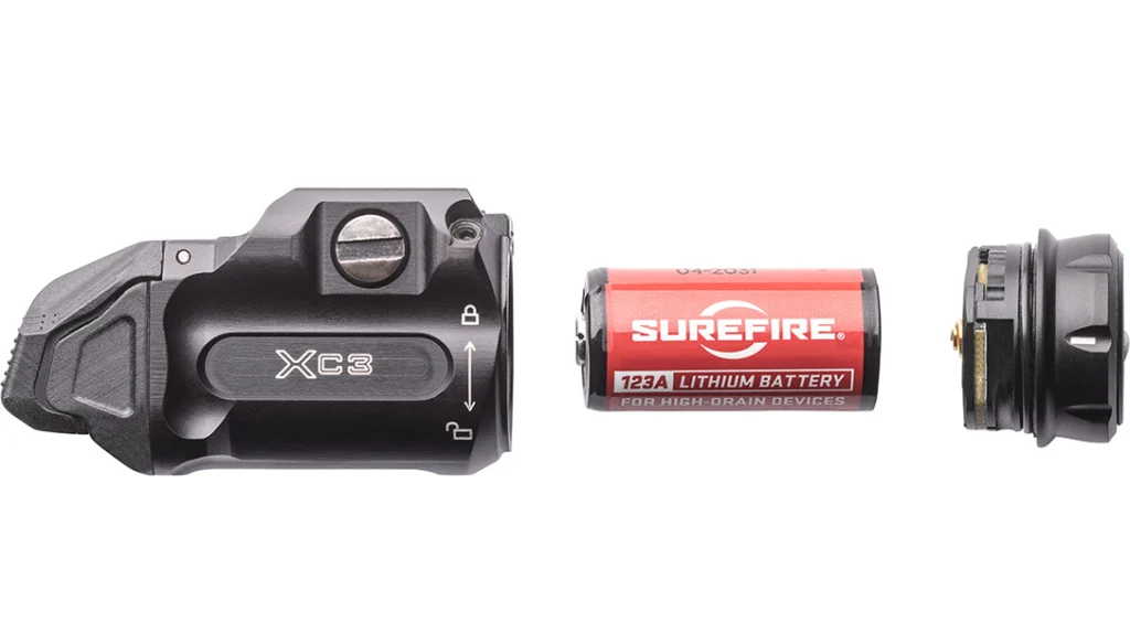 Power comes from a single 123A lithium battery, delivering approximately 1.75 hours of runtime. The battery loads from the front of the light, which means users can swap batteries without removing the unit from the pistol—a small but meaningful advantage during maintenance or extended use.