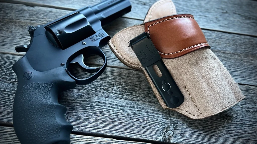 Mike “Doc” Barranti, of Barranti Leather, just introduced the Texas Tuck™, a rough-out leather holster body with a metal reinforced throat band to keep the holster mouth from collapsing when the gun is drawn-this also makes one-hand re-holstering possible. Barranti uses an UltiClip on the IWB holster so it can attach to the waistband or belt and still provide unmatched security, yet allow the user to get a full firing grip on the gun before drawing it.