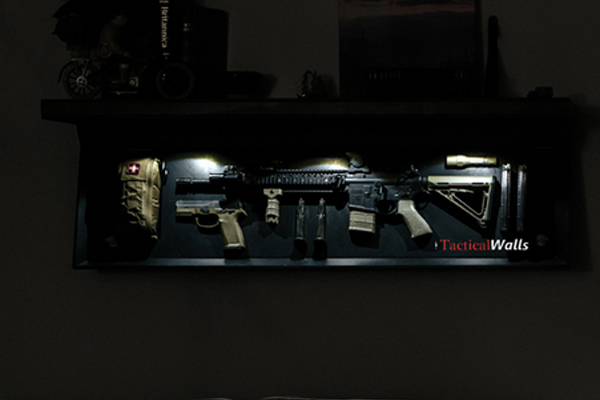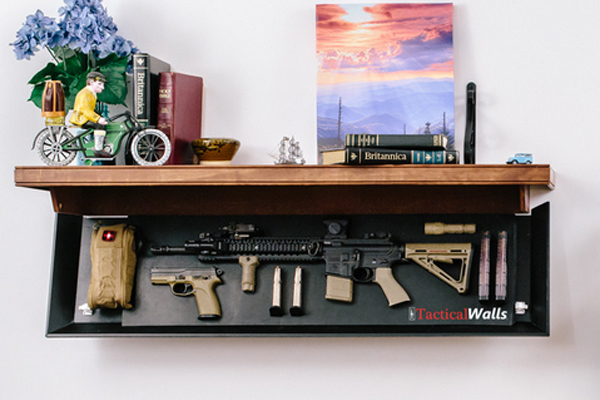 The Tactical Walls Concealment Rifle Length Shelf (1242 RLS) is latest offering to assist you with your home defense plan. The elegant shelf is crafted in the United States with real hardwood that will bring a touch of style to any room. It is easy to install with all the usefulness of a shelf, the 1242 packs an extra punch with the discreet foam lined cavity hiding just beneath the surface. To access the concealed compartment simply disengage the two hidden locks with the supplied magnetic keys, and once the locks are disengaged the lower half of the shelf is smoothly lowered with the assistance of pneumatic struts. Optional L.E.D. lights light the way as you access your hidden cache.