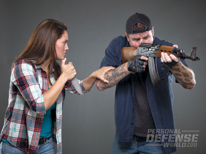 When you are within range, drive your left hand into the stock of the weapon so it strikes the attacker’s jaw to stun him. If he does not have a true cheekweld or is firing from an underarm position, you can use your left hand to strike his exposed head or simply skip the initial strike.