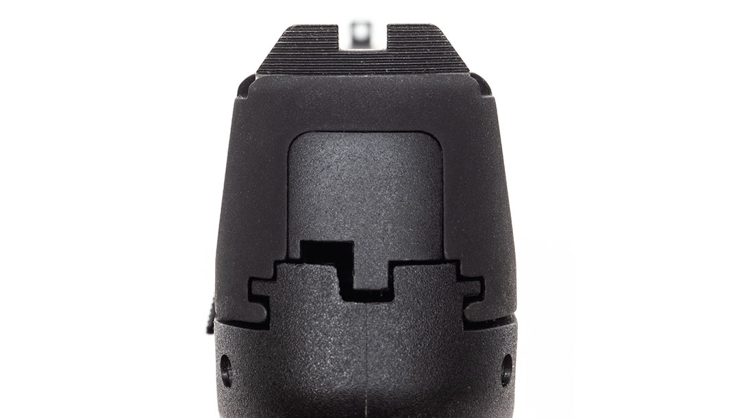 Up top, the G3C includes front and rear cocking serrations on the slide for easy manipulation. In addition, is a Tenifer finish that provides robust corrosion resistance. The sight arrangement is improved over the G2 series with a white dot up front and a serrated and blacked-out rear sight.