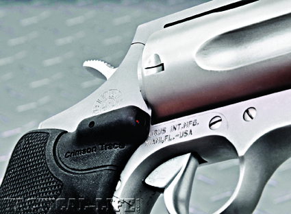 Fitted with the Crimson Trace Lasergrips you give up some of the recoil dispersion of the Taurus’ energy absorbing “ribber” grips, however, the Crimson Trace also uses rubber rather than hard plastic for their grips. The tactical advantage of the laser is not only the improved aiming ability, particularly in a low light situation, but also as a great psychological weapon. As Morrison points out, “If you put the laser on someone and they see the red dot on them they don’t want to get hit.” The psychological advantage is that it instantly throws your adversary off-balance and they want to move out of the way. The tactical advantage is you have a better chance of aiming under the high tension and adrenalin rush that comes from a confrontation.
