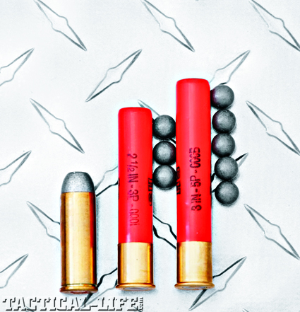 In addition to Winchester’s standard 000 buckshot in both 2½-inch and 3-inch chamberings, Federal Premium makes a special 2½-inch 000 buckshot load for the Taurus Judge Public Defender that has four pellets instead of three. Paraklese Technologies makes a 3-inch .410 shot shell loaded with six .330 caliber 00 pellets, a .410 loaded with five .375 caliber pellets (which they term 4-ought buckshot or Ultra Buck), a .45 LC 185-grain JHP, a 230-grain hard cast LRN .45 LC, and a 2½-inch .410 shot shell packing four .375 caliber 4-ought pellets.