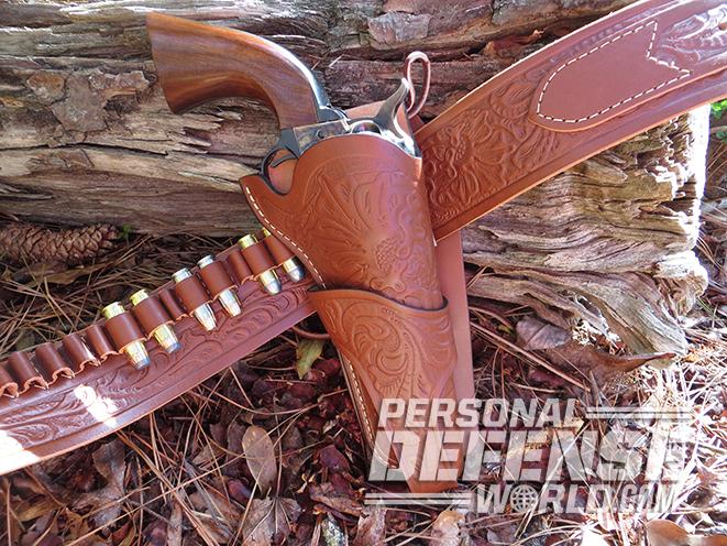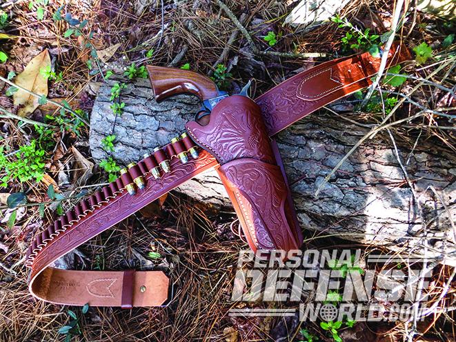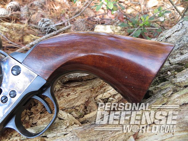 The gun sports a traditional blade front sight, and the groove in the topstrap serves as the rear sight. The ejector rod uses a crescent-style head, and it pivots away from the barrel when in use so your fingertip does not get singed when unloading after extended shooting. The front edge of the cylinder is also slightly beveled, so reholstering—something you do a lot in Cowboy Action Shooting—is smoother with less resistance. The edges on the revolver were also nicely rounded. Similarly, the hammer spur was finely checkered for sure, no-slip cocking.