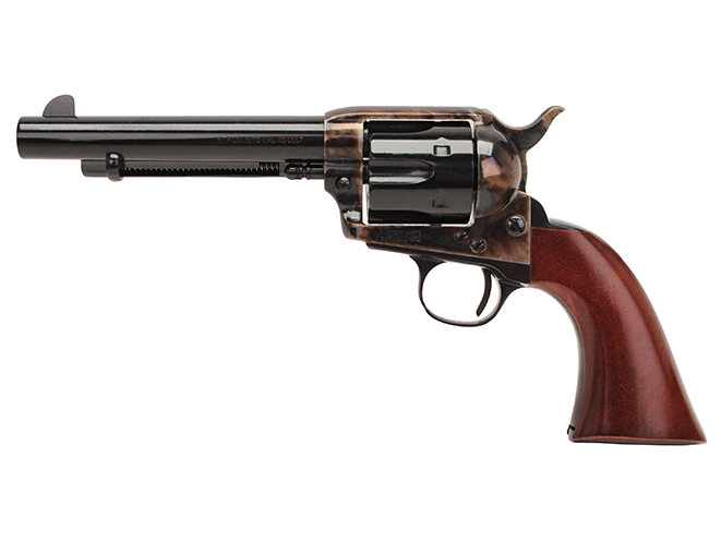The Taylor’s & Company Gunfighter reminds me a lot of that scene in The Good, the Bad and the Ugly where Tuco enters a gun shop and takes apart a few revolvers, then reassembles the parts from different guns to make his own. The Gunfighter features the larger grip of a blackpowder Colt Model 1860 Army revolver and the frame of a Colt Model 1873 Single Action Army. The result is an extended grip that is longer and more comfortable to shoot, especially for modern-day shootists blasting banditos made of steel and paper.
