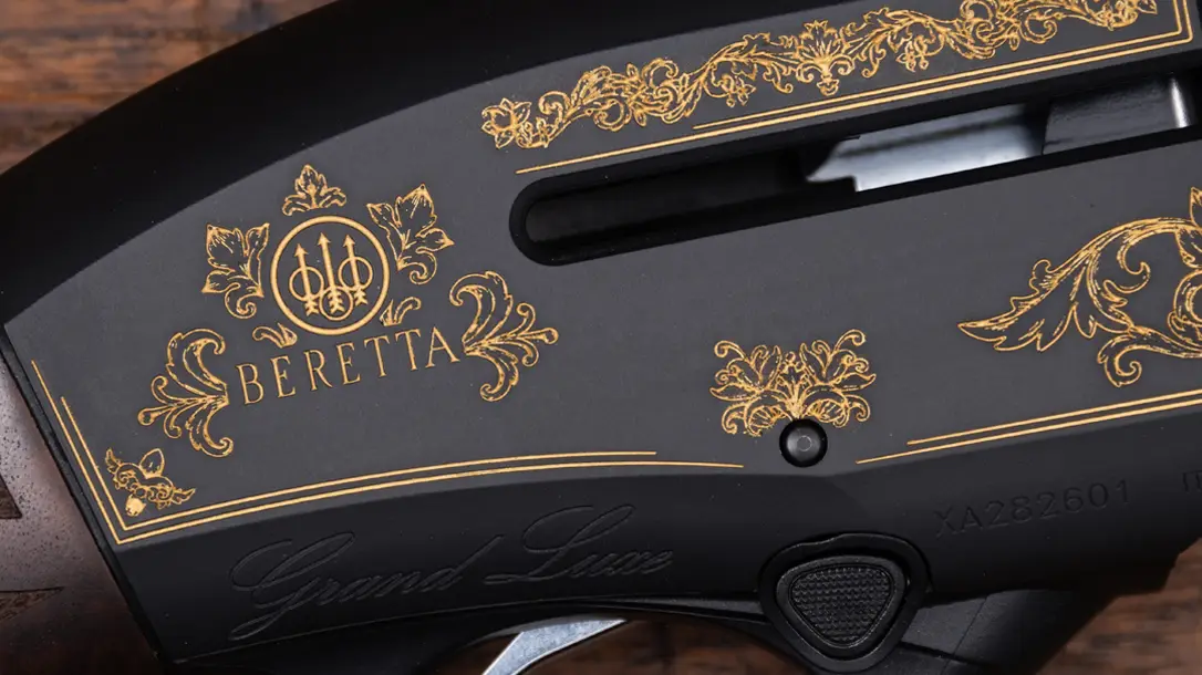 Finished in Matte Black Cerakote, the receiver provides both durability and a perfect canvas for intricate laser-engraved designs. The exclusive Baroque floral motifs and scroll patterns add an air of old-world elegance. This creates a striking contrast against the dark, modern finish. These engravings are inspired by the ornate firearms of yesteryear. This gives the A400 Grand Luxe a genuinely distinctive and classic feel.