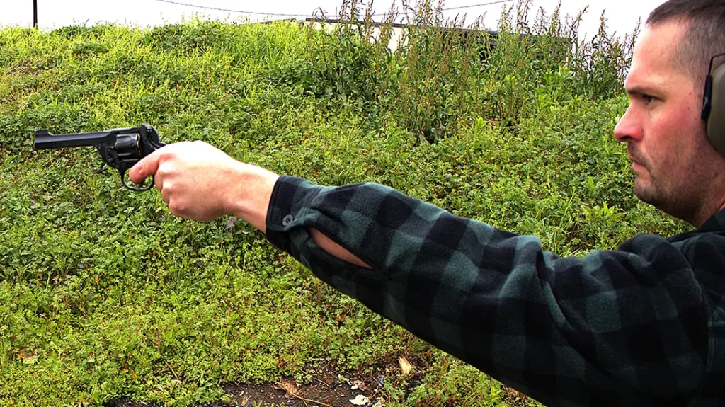 So, by judging the book by its cover, I expected accuracy and shoot ability to be worse than they actually were. The No. 2 Mk. I* is surprisingly ergonomic, and despite it being double action only, I had no problems hitting targets out to twenty-five yards. Past fifty yards, the .38 S&W rounds had the trajectory of a thrown rock, and I had to walk rounds into the target to get hits out to 100. But that isn’t the kind of shooting a pistol is truly designed for.