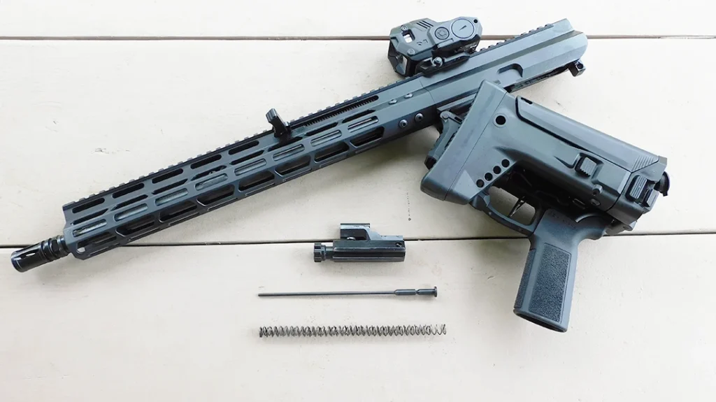 The folding stock obviously implies that this rifle possesses an internal recoil spring–as opposed to a buffer tube. The Monolith’s recoil spring runs from the gas key and is connected by a steel guide rod. It’s still a direct-impingement system, except that it uses a much shorter bolt carrier. Anyone familiar with a standard AR-15 will recognize the cam pin and cotter pin holding the firing pin in place. The Monolith’s bolt is a little heavier, but it functions similarly by rotating to lock. The mid-length gas system the Monolith uses has shown itself to be very reliable to date.