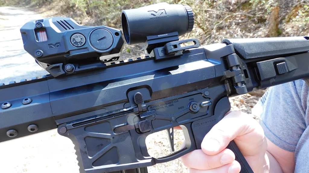 The Monolith’s lower receiver is quite similar to that of a “nice” AR-15, with everything ambidextrous. Its safety lever is tactile and lies just where you expect with either hand; its magazine release is the same. Although the button is bigger than the standard AR-15 mag catch, a detail I like. Similarly, the dual-sided bolt catch is also oversized and easy to reach.
