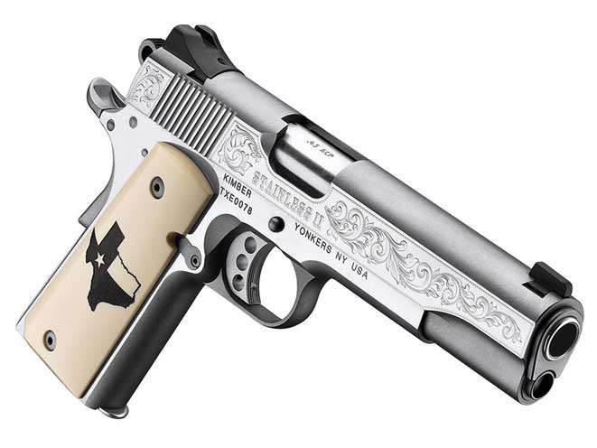 The limited Stainless II (Texas Edition) boasts a unique serial range that begins with the prefix TXE. This gun includes high polished flats on the slide and frame, which help to accent the western leaf and scroll engraving with saw tooth border on the slide. The mainspring housing also has a matching engraved pattern. The 1835 motto, “Come and Take It” appears not he left bonded ivory grip panel, and the Texas state flag appears on the right panel. MSRP is $1633.