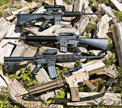 The author tested point-of-impact changes with four ARs. From top: A Colt Lightweight Sporter, Colt Sporter II, Stag Model 3 and Colt a AR-15A3 Tactical.