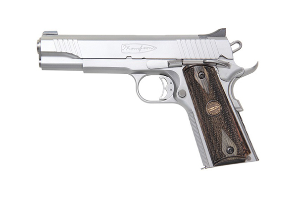 Additional features include an adjustable trigger, combat hammer, stainless steel, full-length recoil guide rod, extended beavertail grip safety, extended magazine release, checkered laminate grips with a Thompson bullet logo inlay and a checkered slide stop lever.
