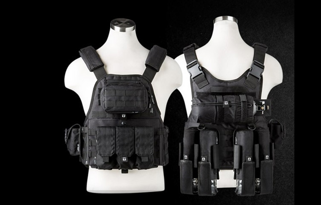 The Tiberius Arms EXO Tactical Vest is available in two variants: the EXO Recon Vest and EXO Assault Vest. The EXO Recon Vest includes a closed-top triple mag/pod pouch and 2+3 pod holder (for paintball). Similar to the Recon, the EXO Assault Vest also includes a closed-top triple mag/pod pouch. It also has a utility pouch, tank pouch, grenade pouch, and two 2+3 pod holders. Manufacturer suggested retail price for this brand new vest platform is not yet available.