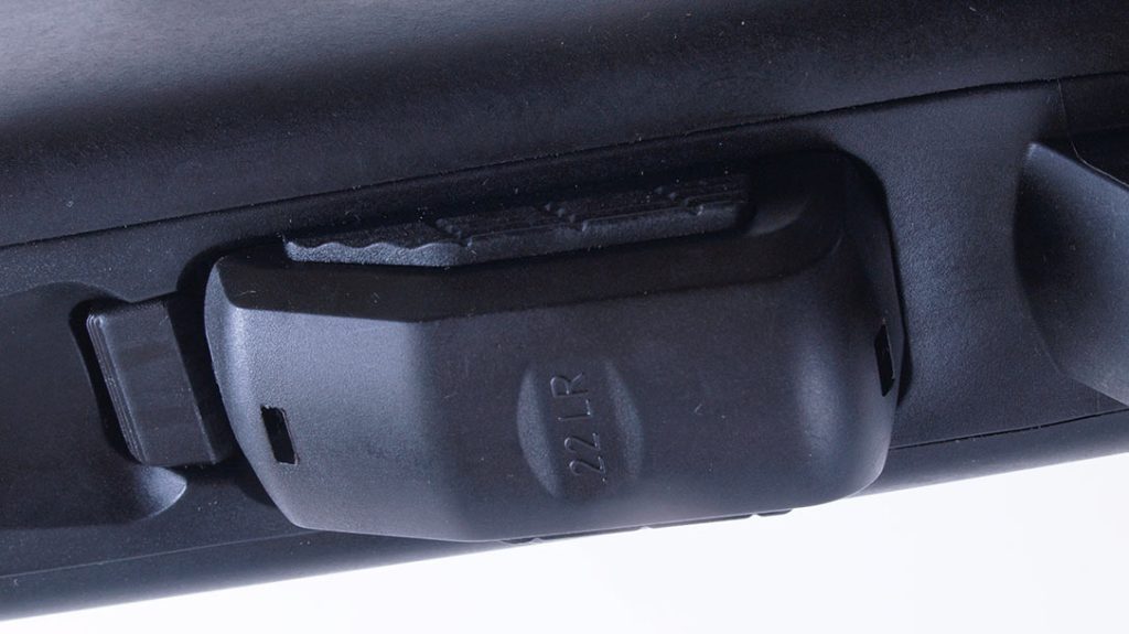 Though the magazine destroys the flowing lines of the stock by conspicuously protruding from the bottom, its design is quite functional. The base plate is very wide and rounded, enabling you to use it for handy palm rest if you place your support hand under the triggerguard and brace your elbow against your stomach, as competition shooters do.