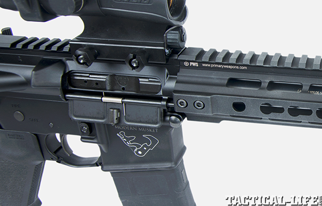 6. The Modern Musket handguard mates with the flattop upper receiver to provide lots of acreage for an officer to mount optics or traditional sights.