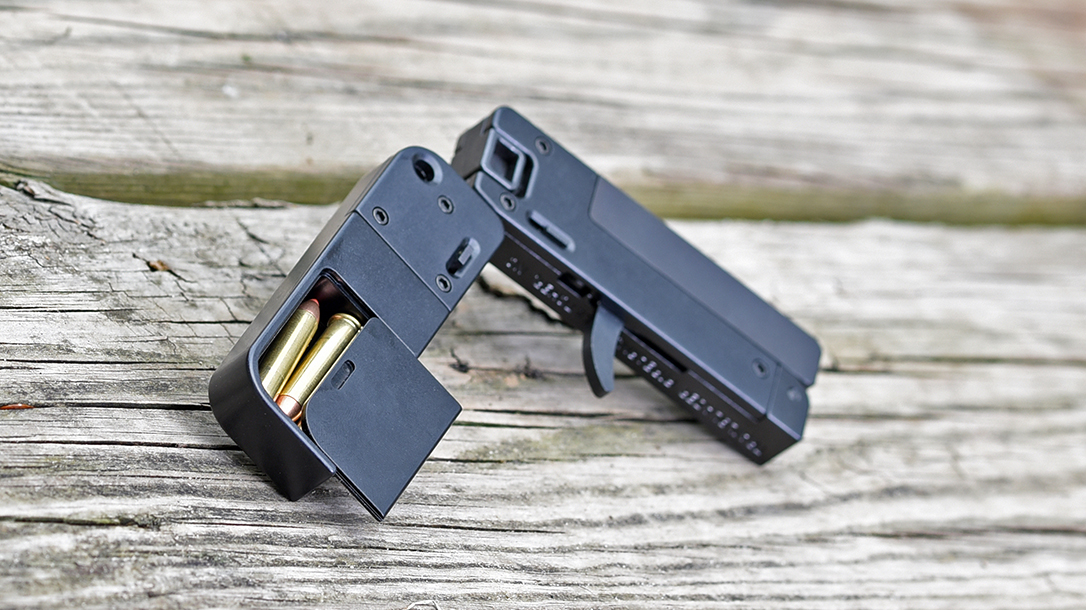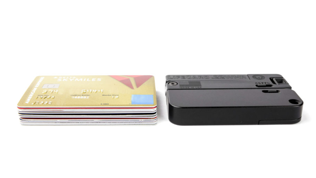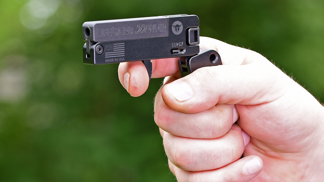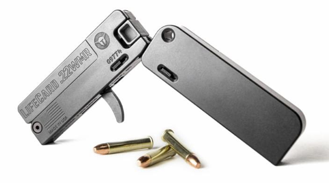 The LifeCard is a single-shot, .22-caliber handgun that carries another four rounds in the grip. And since the gun folds into a pistol shape before firing, it transfers like any other unrestricted handgun. Altogether, the LifeCard weighs a whopping 7 ounces.