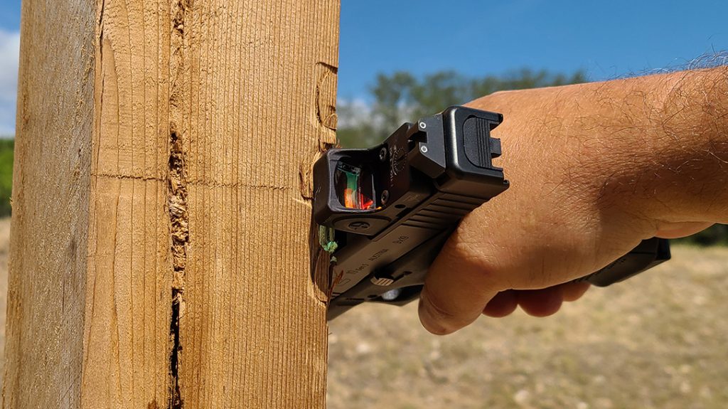 Another concern I had was durability. We put that to rest when we racked our pistols on the posts we shot around. In fact, the reps from Trijicon asked us to set up malfunctions and clear them by racking the gun hard on the posts. I took this to heart and thought, “It’s not mine,” before going to town on the post. I had multiple deep gouges in the post from manipulations and each time I would raise the gun back up, the optic was still running and holding zero. This was capped off when we were encouraged to unload and actually bang the optic on the post.