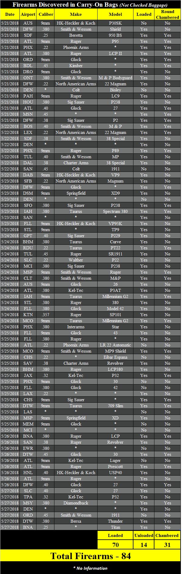The 84 guns found from May 21 through 21 pales in comparison to the week before, when a whopping 101 guns were discovered in carry-on luggage at various airports throughout the country. In that week, 9mm and .380 ACP were the most common cartridges, while Smith & Wesson was the most common manufacturer at 19; Glock came in a close second at 17.