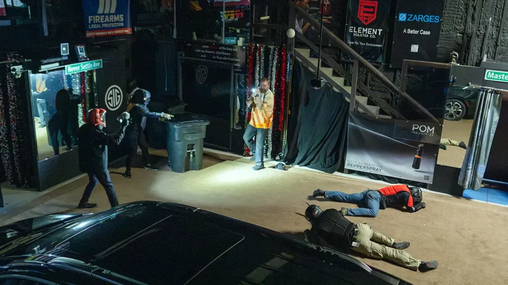 The only thing you can expect from low-light scenario training is that you can’t predict what will happen. Philip Toppino, the Director and Founder of W.O.F.T., is the lead scenario training instructor. He assigns the assistant instructors roles to play in each scenario and instructs them on how to respond to the students based on their reactions. Everyone in my small group who participated in the low-light scenario training together carried a gun daily, which meant we got to use simulation guns. Outfitted with a holstered SIG Sauer P365 simulation gun and spare magazine pouch, we all began with two magazines each. Students faced multiple scenarios in daylight and low-light settings with varying degrees of threats and non-threats.