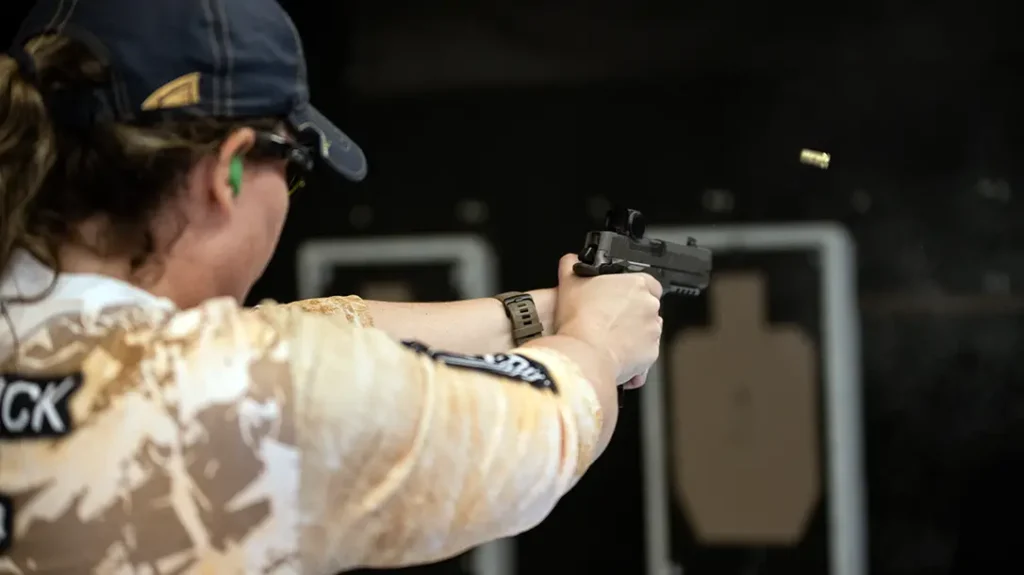 It doesn’t matter how advanced a shooter you are; everyone needs regular firearms practice and has things they need to work on. Our group had two range sessions and was given Sig Sauer pistols, all mounted with red dot optics, to train with. The P320 striker-fired pistol is an easy-to-shoot full-size pistol for new and advanced shooters alike. I know many pro-level and entry-level shooters who use this in shooting competitions. With my higher experience with firearms, the W.O.F.T. team allowed me to use the P226-XFive, a single-action-only 9mm pistol with an external thumb safety and flat trigger. I mostly shoot double-stack 1911s when I compete, so this gun was right up my alley.