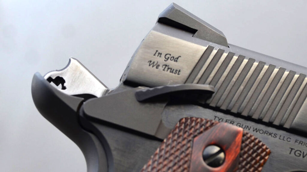 Besides the deep cocking serrations fore and aft, the slide features the laser-engraved legend, “In God We Trust,” on the right rear of the slide. Likewise, the word “Government” is engraved underneath the lowered and flared ejection port.