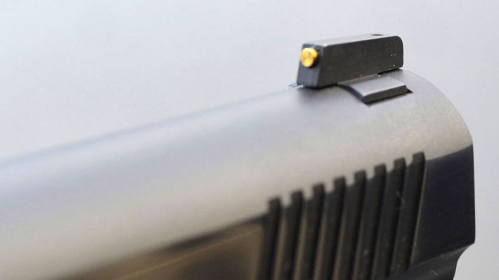 The slide is outfitted with a genuine Novak rear sight that is drift adjustable in its dovetail for windage correction. Tyler opens up the notch on the rear sight enough that there is plenty of light on each side of the front sight to get perfect alignment. So often, this is not the case, and the front and rear sights blur together.