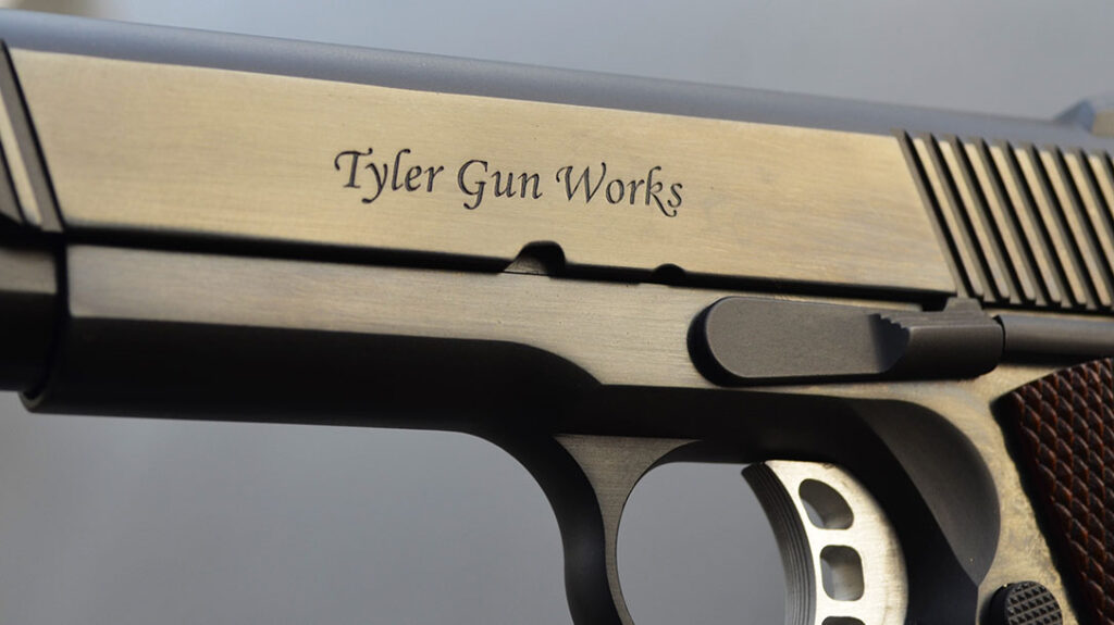 On the left side slide flat, “Tyler Gun Works” and an American flag are engraved. The flats of the slide and frame are polished bright, while the rounded parts, like the slide top and frontstrap, are bead-blasted matte.