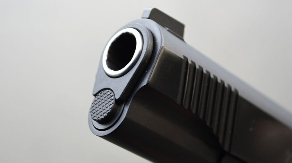 With the internals removed from the slide and frame, I mated the two parts together. Placing the slide at its “in battery” position, there wasn’t a hint of wobble between the two parts. Raising the muzzle to 45ᵒ, the slide slid unhesitatingly to the rear. There were no signs of tight spots that might impede the slide’s cycling. Correspondingly, the TGW Government model uses a match-grade, stainless-steel barrel.