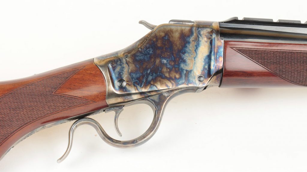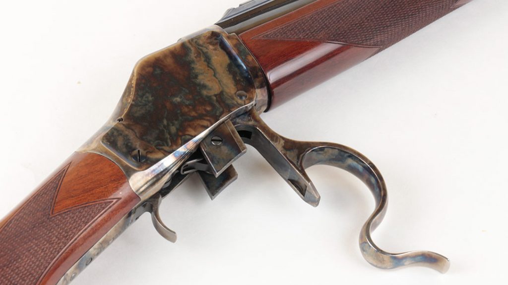Loading and unloading the falling block is easy. You open the action by lowering the lever that extends from the rear of the triggerguard. When closing the action, the hammer automatically moves to the half-cock notch. That eliminates the need to lower the hammer over a loaded chamber and the possibility of fumbling the hammer in the process.