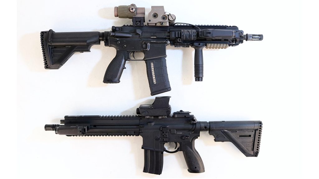 The HK416 was originally supposed to be the HK M4, but Colt purportedly threatened a lawsuit. The gun indeed resembles an M4 on the outside. However, underneath the hood it is a different beast entirely. For starters, the HK416 is a piston-driven rifle. The action is inspired by the original AR-180 that Gene Stoner intended to replace his previous M16. This design ensures the receivers remain tidy and keeps the heat and chaos up in the handguard where it can’t hurt anything. Disassembly involves using one of the bolt lugs as a wrench to remove the railed forearm and strip the piston system. The resulting rifle is markedly heavier than a comparable direct impingement M4 but is hugely more forgiving and reliable.