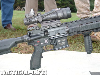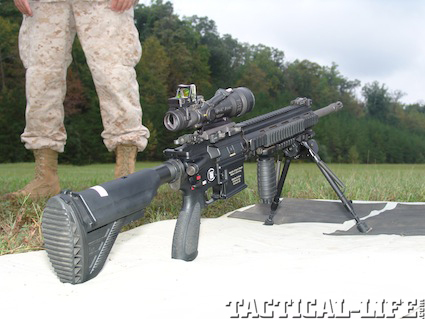I found the M27 controllable with its comfortable and fully adjustable stock. The rugged Trijicon TA11 SAW optic made it really hard to miss on full-auto or with single shots that dropped targets at 300 to 500 meters like a precision rifle. The M27 has a higher rate of fire than the M4, so putting a high volume of fire downrange is easily accomplished. Overall, the M27 is an effective battle weapon, and since the squad machine gunner is always a primary target for bad guy snipers, having a light automatic weapon that looks just like an M4 might make that job a bit safer too!