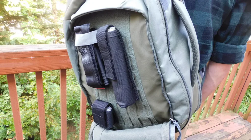 The front of the laptop pouch and the remaining compartment wall are covered in Velcro loop that’s compatible with the Vertx Tactigami attachment system. The Commuter comes with the Vertx Double Admin Panel, which I have attached in the main compartment. It currently holds a knife and a flashlight. I added a smaller Tactigami Admin Panel for pens and a smaller flashlight.