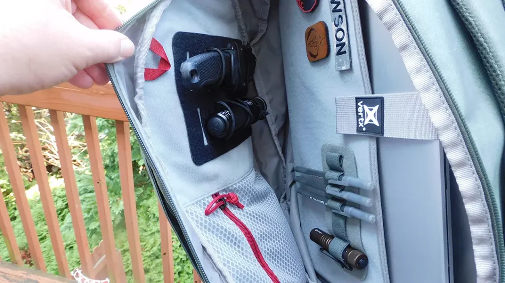 The main compartment’s interior is a light grey color, making it easy to see what I have. That’s a nice touch by Vertx. I don’t know how many times I’ve used a flashlight to see down in the depths of a pack. No need with the Commuter Bag. Everything is easily visible.
