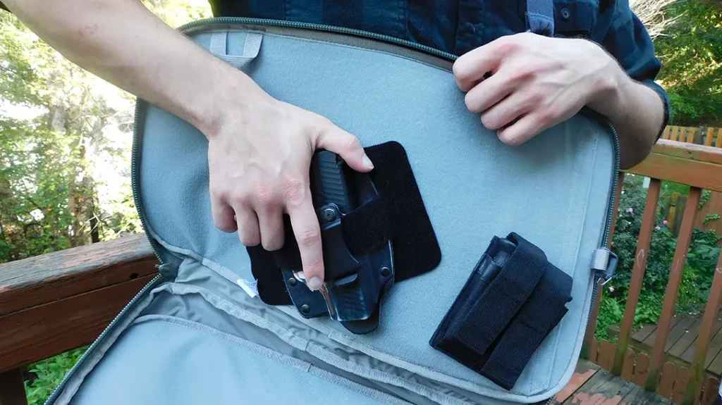 The large concealed carry compartment is completely lined with Velcro loop so you can attach your handgun, or whatever, however you like. The Commuter Pack is compatible with the Crossbreed Modular Holster, but it’s not required. I have a Vertx Tactigami attachment securing a standard concealed carry holster with my Walther PPS. I lined it up for maximum accessibility as I pull the bag around from my back. Another attachment holds two spare magazines.
